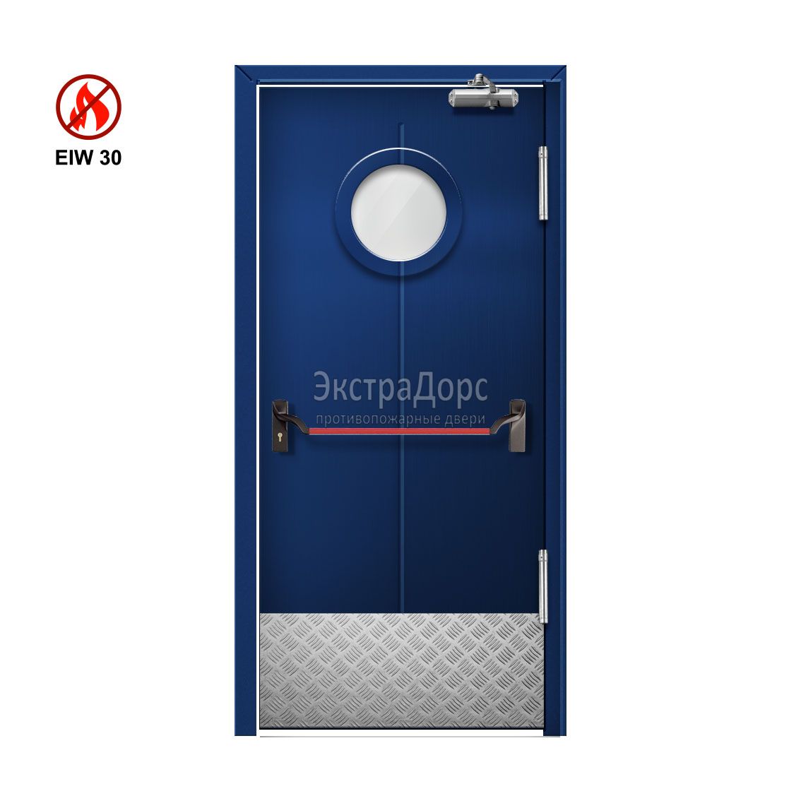 Маятниковая противопожарная дверь остекленная EIW 30 ДОП-01-EIW30 с антипаникой ДП24 – надежное решение для защиты вашего объекта от пожара. Эта противопожарная дверь сертифицирована по классу огнестойкости eiw30, что гарантирует эффективную защиту от распространения огня и дыма в течение времени эвакуации. Прочная однопольная конструкция в сочетании с полотном толщиной 50 мм и стальным листом 1,2 мм создает непреодолимый барьер для огня. Дверное полотно установлено в надежную коробку, а специальный уплотнитель предотвращает проникновение дыма. Размер 200х80 см подходит для большинства проемов. При необходимости мы можем выполнить дверь в любом другом размере под ваш запрос. Стильная отделка и ультрамариново-синий (ral-5002) цвет делают дверь эстетически привлекательной. Эта противопожарная дверь – идеальное решение для любого помещения. Маятниковая противопожарная дверь остекленная EIW 30 ДОП-01-EIW30 с антипаникой ДП24 - это не просто дверь, это – гарантия безопасности, подтвержденная всеми необходимыми сертификатами. Сделайте правильный выбор в пользу безопасности! Наши специалисты помогут подобрать оптимальную комплектацию и организуют доставку с последующим монтажом в удобное для вас время.