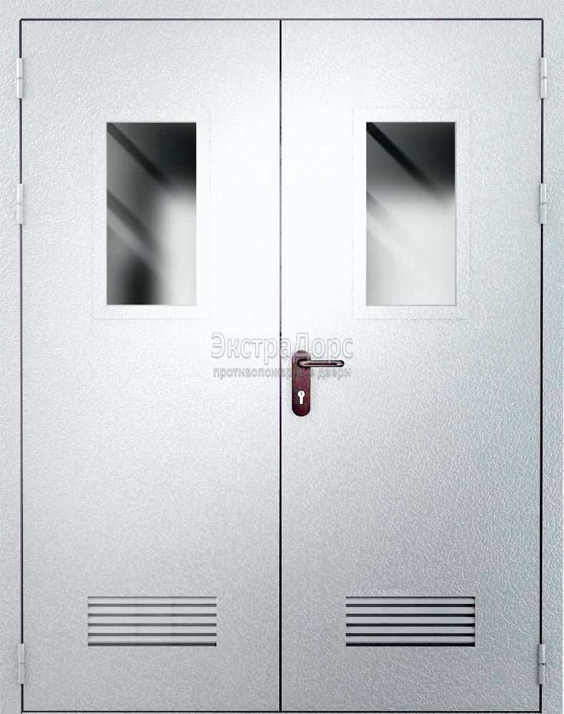 Двухстворчатая огнеупорная дверь EI 60 с выпадающим порогом, стеклом и решеткой в Долгопрудном