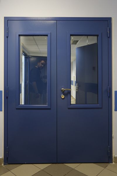 Противопожарная алюминиевая дверь синего цвета в Долгопрудном
