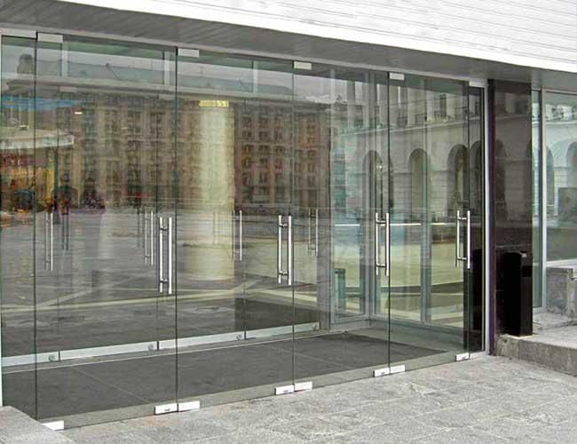 Противопожарная безрамная дверь со стеклом в торговый центр в Долгопрудном